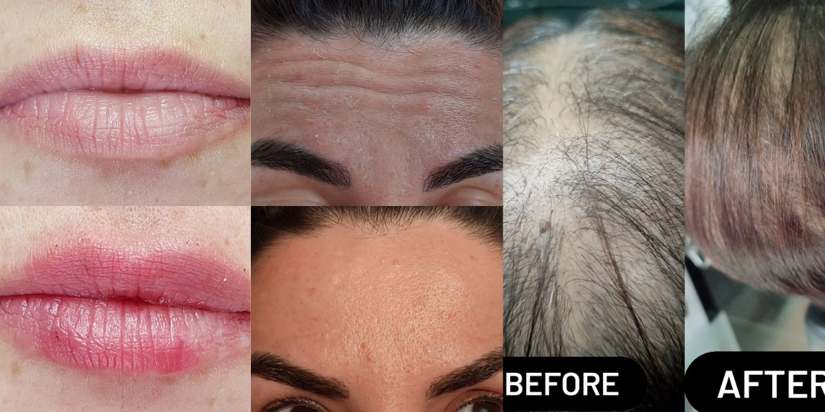 Noticeable transformation: reduced fine lines, improved skin texture, and visible hair growth.